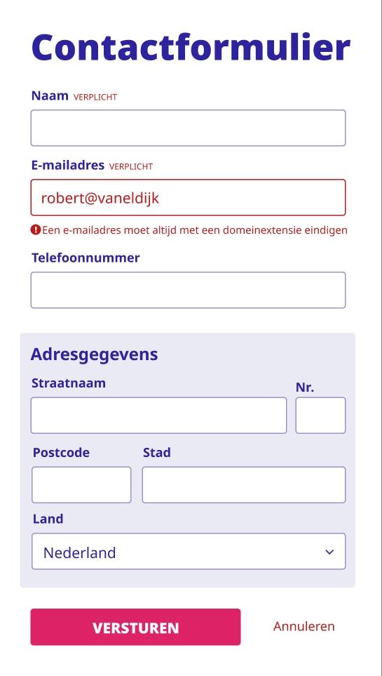 - Als iemand iets fout heeft ingevuld geef dan duidelijk aan welk veld foutief is ingevuld, wat er niet correct is ingevuld en hoe dit verbeterd kan worden.