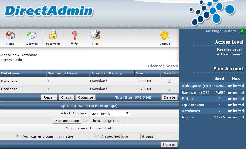 De database is niet te benaderen via een FTP-programma en we moeten deze op een andere manier zien op te slaan. De meeste hostingproviders bieden een control panel waarbinnen het downloaden van de database vrij simpel uit te voeren is.