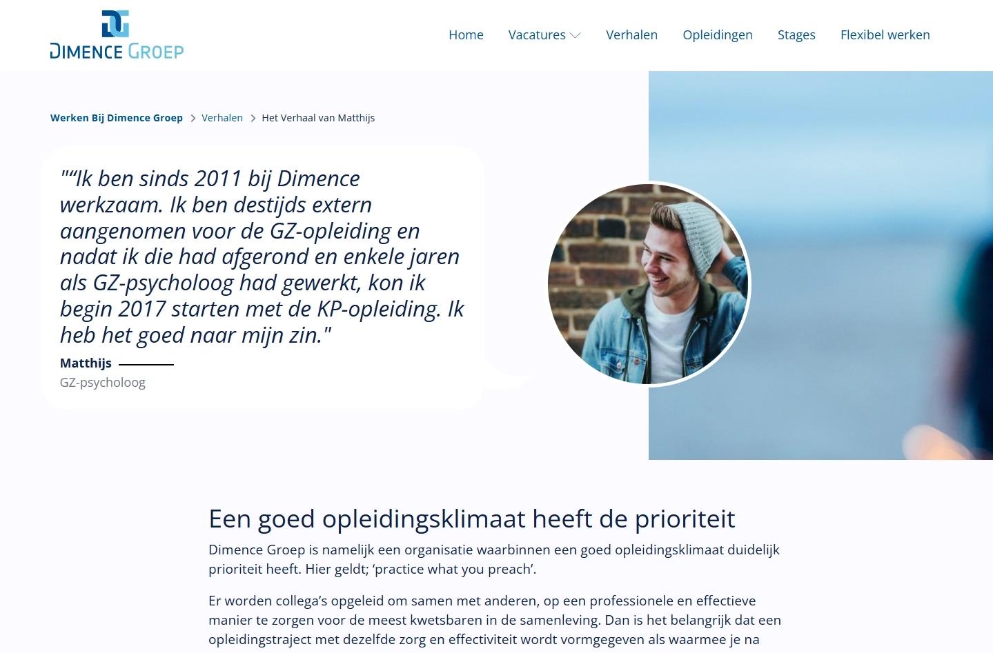 - Aantrekkelijke tone of voice: Waar de corporate website vaak een formele stijl heeft en bedoeld is om potentiële klanten te overtuigen, kunnen werken-bij-websites met een persoonlijkere en informele toon juist een prettige indruk maken op potentiële medewerkers.