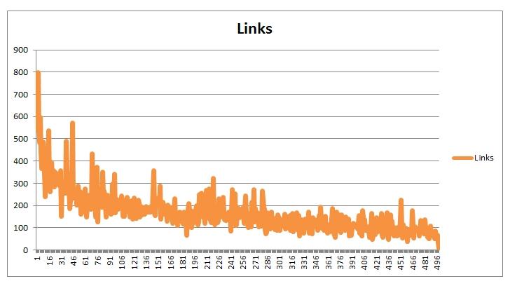 Hierboven zie je de de pagina's die zijn onderzocht. De oranje lijn laat het aantal woorden zien. Hieronder staan in de grafiek dezelfde pagina's maar dan met het aantal links richting de pagina's. Er is een duidelijke correlatie te zien. Meer woorden komt overeen met meer links.