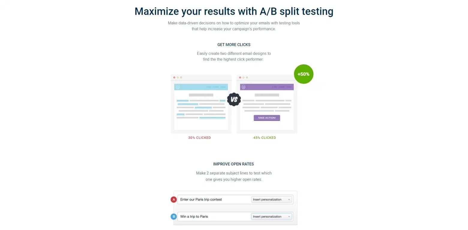 Hieronder heb ik de landingspagina opgedeeld en zie je welke onderdelen de marketingafdeling van Campaignmonitor heeft gemaakt om antwoord te geven aan die vragen. Ze hebben zich duidelijk verplaatst in de bezoeker.