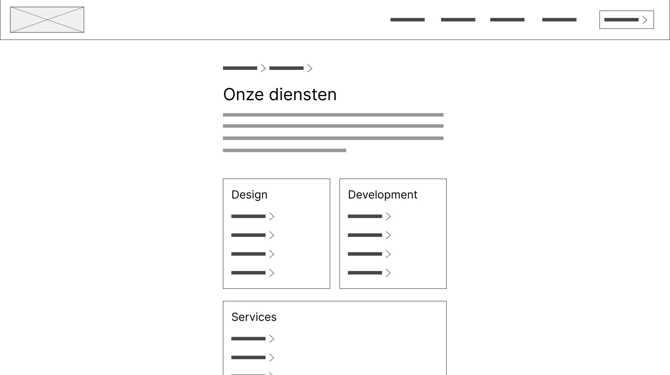 - Besteed niet te lang aan het (laten) maken van wireframes. Bedenk dat het een schets is die de basis vormt voor je visuele ontwerp. Je hoeft niet alle details uit te werken. Met het nadenken over welke elementen je plaatst en waar, maak je vaak al een enorme voorsprong op je concurrentie.